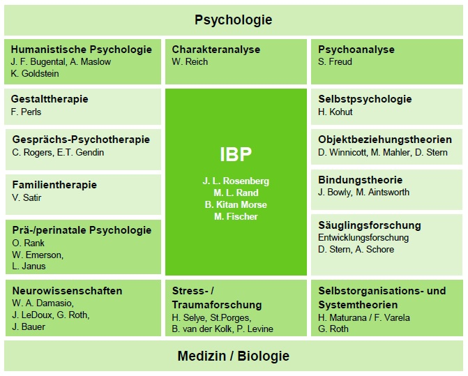 IBP verknüpft wichtige Erkenntnisse und Methoden unterschiedlicher Therapieansätze zu einer ganzheitlichen Therapieform (vgl. Abbildung). Das Persönlichkeits- und Beziehungsmodell erklärt die Dynamik von Konflikten auf pragmatische Weise und bietet konkrete Möglichkeiten im Umgang damit.